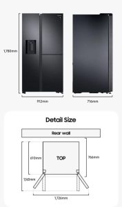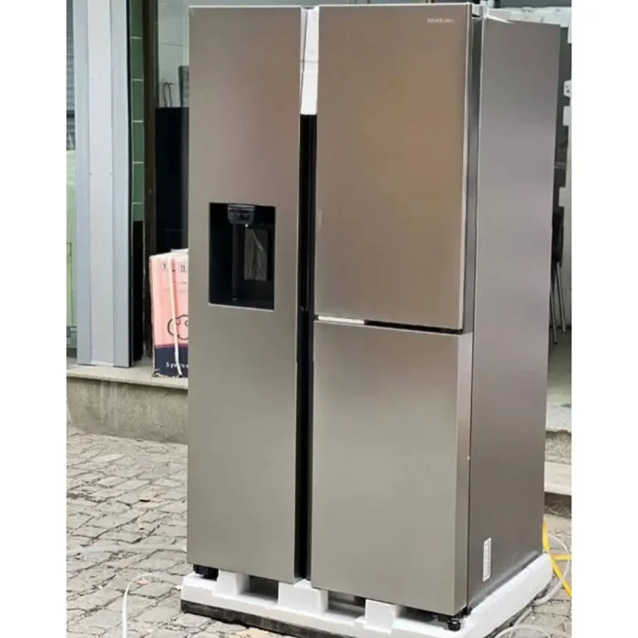 یخچال فریزر ساید بای ساید سامسونگ با رنگ نقرهای دیزاین شده است که بسیار صاف و بدون برآمدگی میباشد این یخچال بدنه محکم و با دوام دارد تا ضد ضربه و ضد خش باشد. شرکت سامسونگ با بهرهگیری از مقاومت بالا برای یخچال فریزر ساید بای ساید توانسته کاربران زیادی را به سمت خود جذب کند. چنین مدلهایی طرفداران بسیاری دارند و کاربران بسیاری هستند که میخواهند این مدل را خریداری کنند. به صورت کلی درب های یخچال فریزر ظاهری شیک و امروزی دارند و راحت باز و بسته میشوند، بدون دستگیره طراحی شدهاند. قسمت دور این دور یا ویترین غذایی یخچال فریزر در مصرف انرژی صرفهجویی میکند و برای نگهداری مواد غذایی پرمصرف مناسب دانستهاند. یخچال فریزر ساید بای ساید سامسونگ با برخورداری از پنل دیجیتالی سگمنتی و دکمههای لمسی بر روی درب فریزر تنظیم دمای یخچال و فریزر و همچنین دیگر تنظیمات یخچال را اعمال میکند. این یخچال دارای قابلیت قفل کودک و همچنین فیلتر آب نیز میباشد که روی این پنل کنترلی قابل اعمال هستند. آبریز و یخریز اتوماتیک نیز بر روی درب فریزر و پایین صفحه نمایش یخچال طراحی شده است که همیشه قابل دسترسی میباشد و برای کاربران بسیار مفید و ایدهآل است. ویژگیهای مربوط به ارتفاع و عمق و پهنای یخچال هم کاملاً استاندارد و با ابعاد مناسبی طراحی شدهاند لذا در متراژهای مختلف آشپزخانه قرار داده میشود. وزن کلی یخچال مورد نظر ما برابر 117 کیلوگرم میباشد.