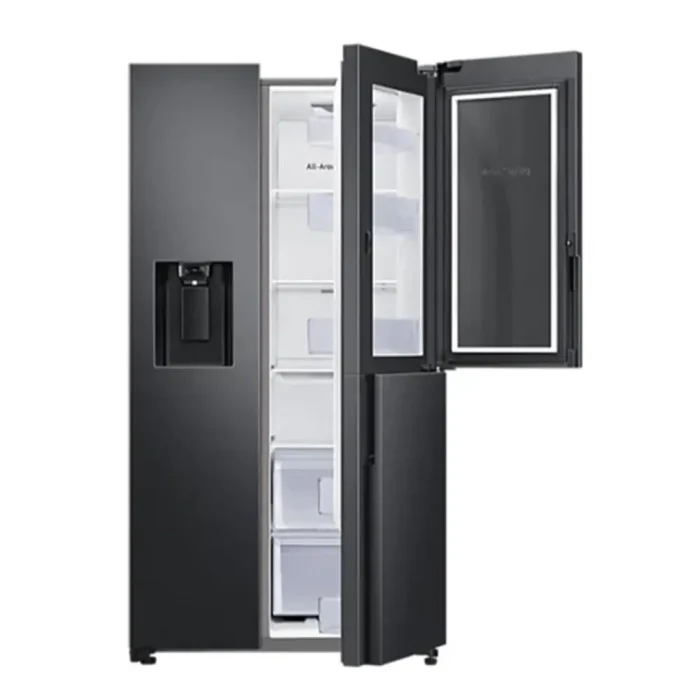یخچال فریزر ساید بای ساید سامسونگ با ظرفیت 30 لیتر برای نگهداری مواد غذایی بسیار مفید است و طبقات متعددی دارد لذا کشویهای آن حجیم و بزرگ هستند که حجم زیادی از مواد غذایی را میتوان داخل آنها قرار داد. طراحی قسمت داخلی یخچال با چهار طبقه شیشهای حرارتی دیده شده و همچنین دو کشوی بزرگ برای نگهداری میوه و سبزیجات و همچنین 5 طبقه بر روی درب تشکیل شده است. کشویهای داخل یخچال برای حفظ رطوبت بسیار مفید هستند و به صورت پیشرفته متفاوت با کشویهای عادی طراحی شدهاند لذا ماندگاری محصولات را افزایش میدهند و برای مدت بیشتری قابل استفاده هستند و دیرتر فاسد میشوند. از طرفی برای بخش فریزر نیز چهار طبقه شیشهای و دو کشوی بزرگ به همراه دو قفسه روی درب اختصاص داده اند. با باز کردن درب فریزر میتوان شاهد یخ ساز اتوماتیک یخچال شد که روی درب آن جای سازی شده است ولی این بخشش هیچ مانعی برای داخل فریزر ایجاد نمیکند. شرکت سامسونگ با پشتیبانی کردن از فناوری SpaceMax توانسته دیوارهای داخلی را با ضخامت کمتری همراه کند و فضای ذخیرهسازی بیشتری را به وجود آورد. به محض باز کردن درب یخچال و فریزر لامپ ال ای دی داخل آنها روشن خواهد شد و روشنایی یکنواختی را به وجود میآورد که راحتتر بتوان به اقلام مورد نظر دست یافت.